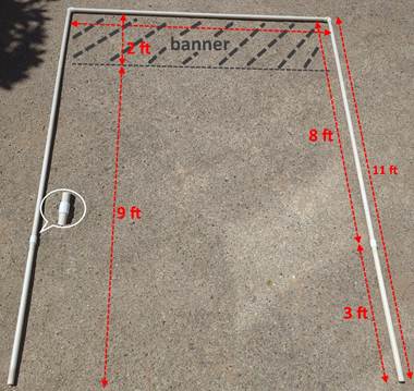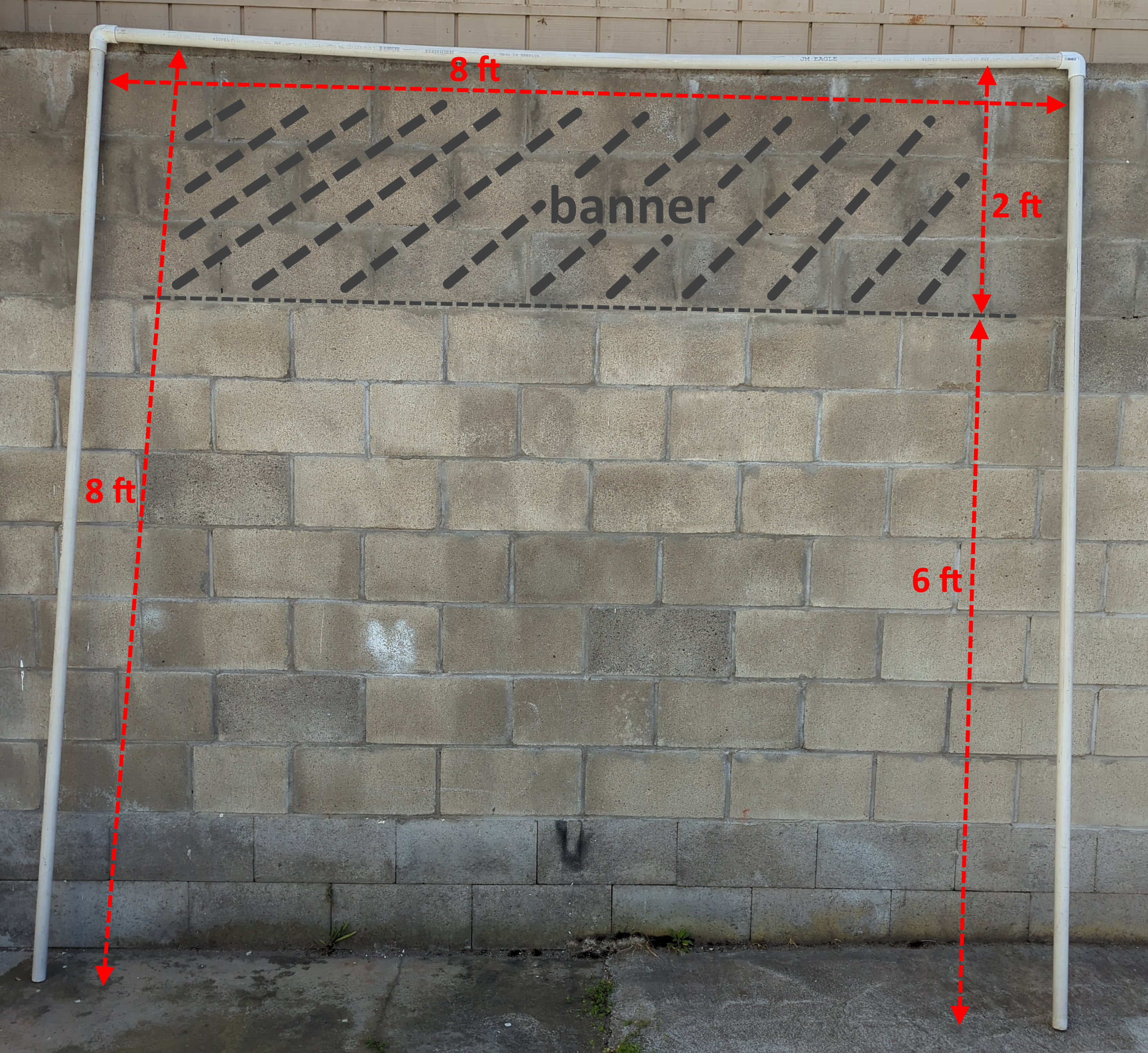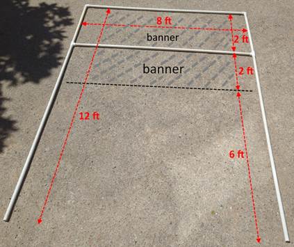 PVC pipes are sold in 10-ft lengths. They are available in two different qualities, so make sure to get the "Schedule 40" type. I cut them down to 8-ft for easier storage and transport. You need a few inches on each side to either hold by hand or attach connectors for the legs, so the banner must be slightly shorter than that, say about 7 feet, leaving 6 inches on each side. Max of 7'6" in length to leave 3 inches on each side to hold it.