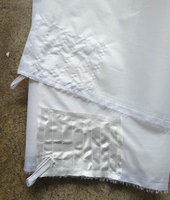 I take this to a seamstress who has experience working with nylon. This material behaves differently than cotton, so some special process is required. All the mods I need, she does for $25 per banner. That's including the cut, the pocket, and the little loop on the bottom to attach to the leg and prevent wind flapping. This makes each banner cost $36 ($11 for the raw fabric) whereas the vinyl I used before was $60 each.