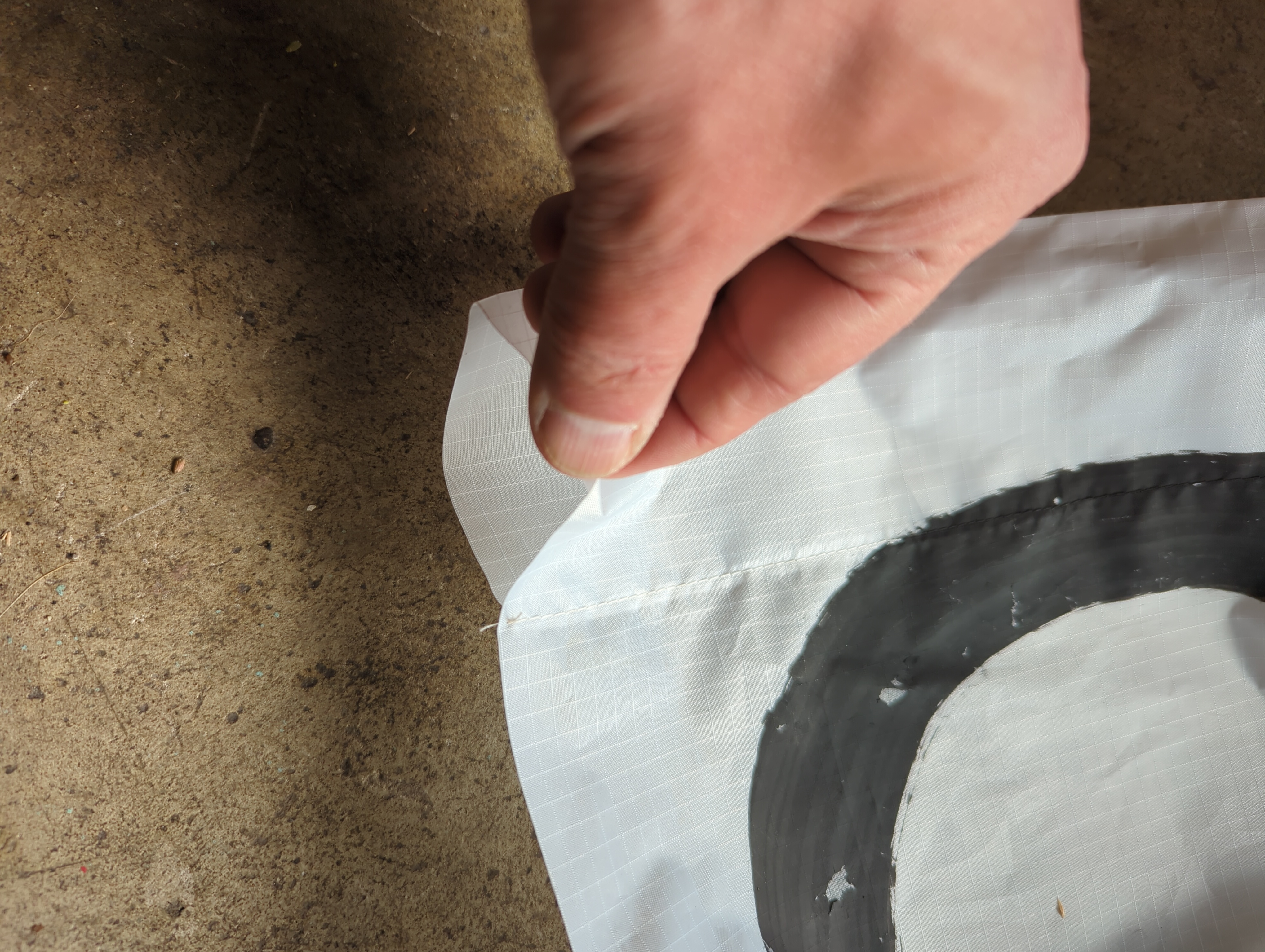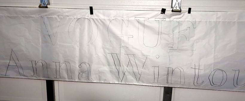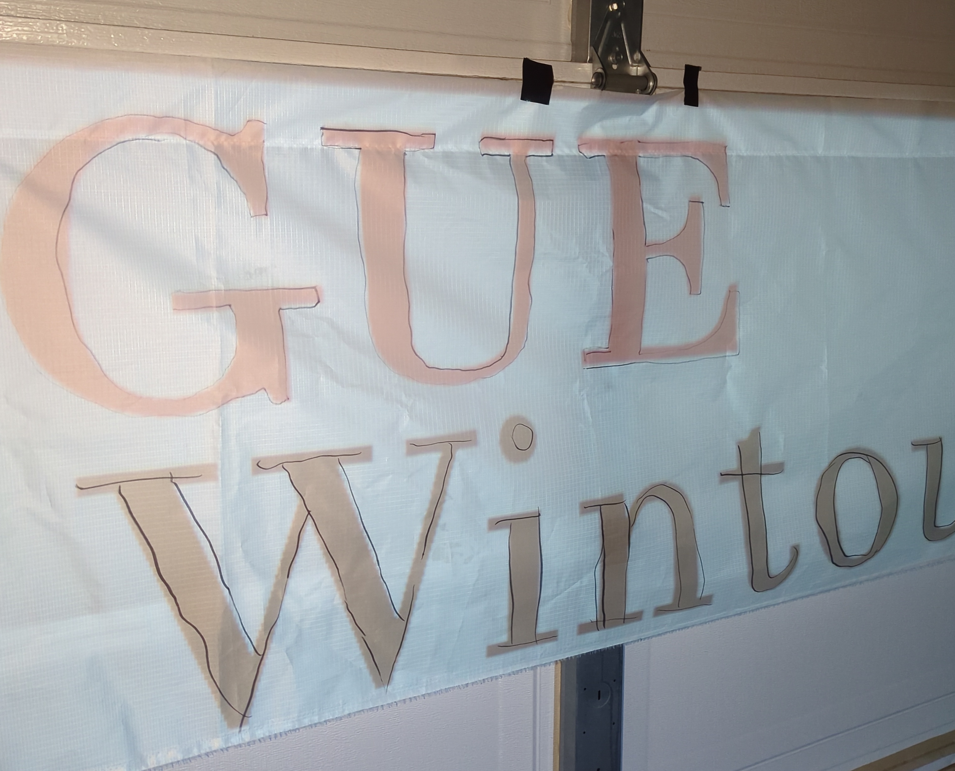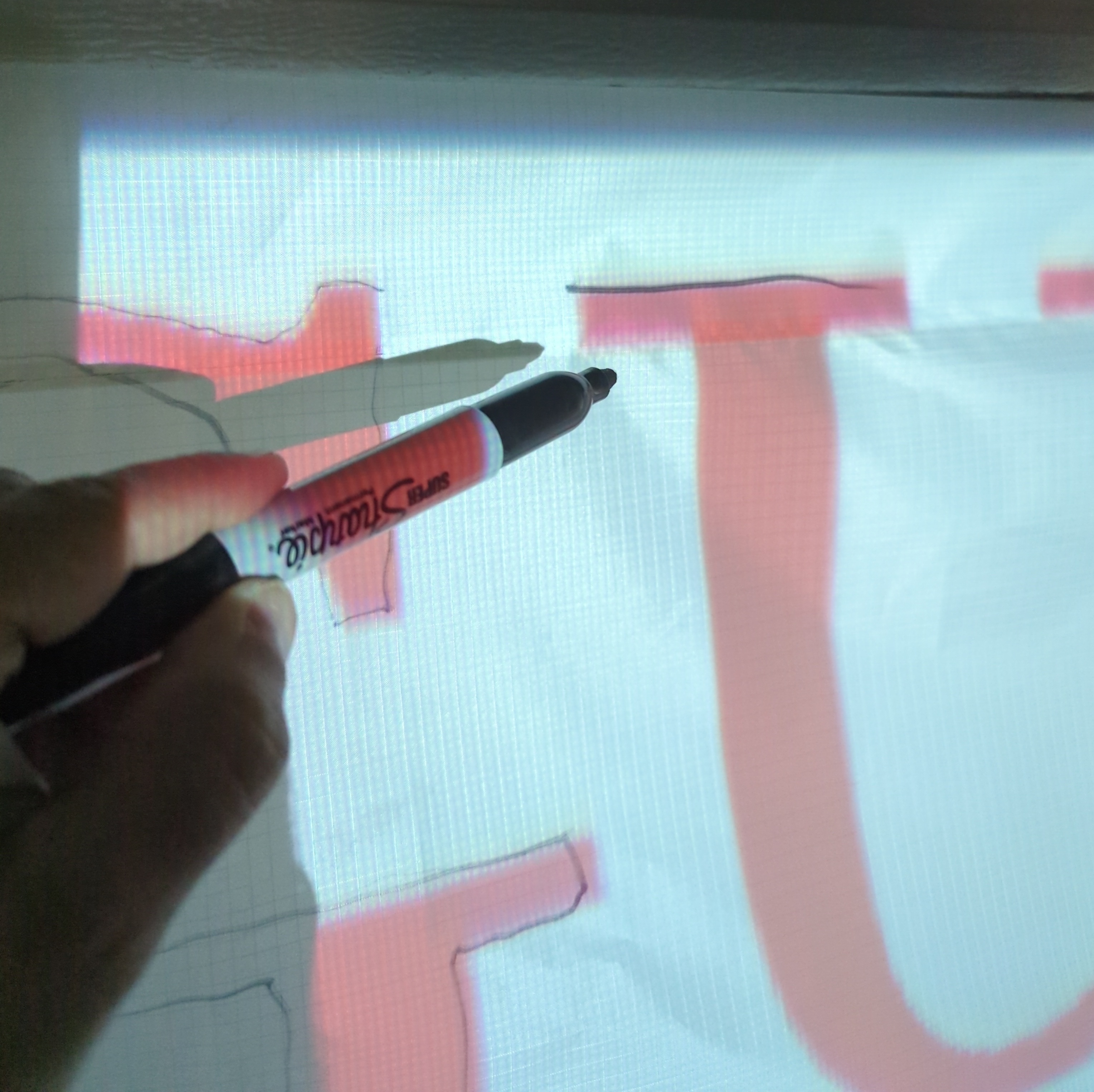 Hanging on a wall works slightly better for outlining with a sharpie, versus a garage door since it's not flat, so much of the tracing is done on a hanging fabric. But I don't have ~15 feet away from a wall with nothing on it or in the way. With a fresh sharpie, though, it's not a big deal, especially on such a plastic-y canvas: